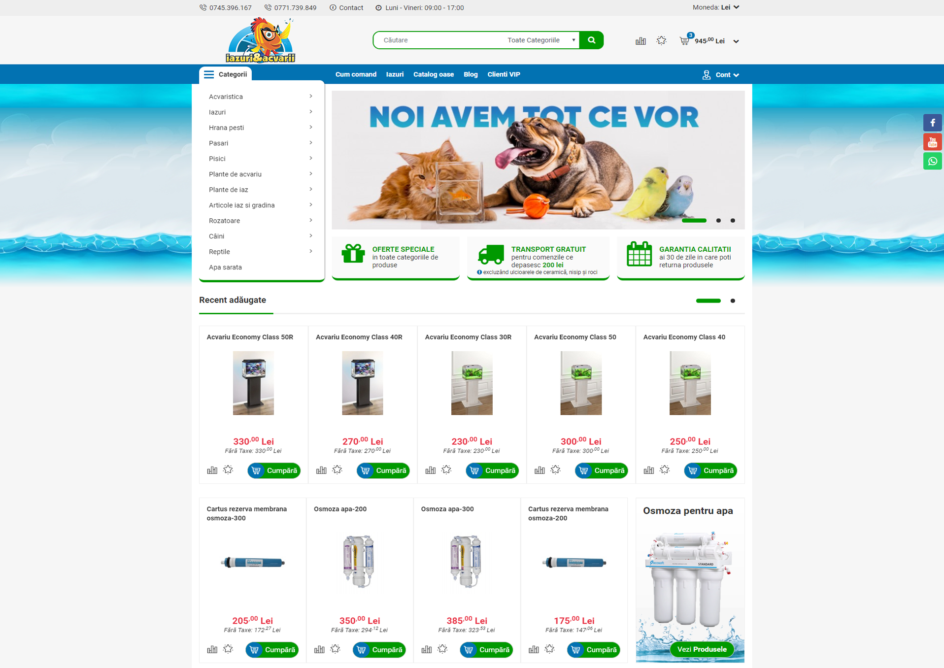 The company sells a wide range of aquarium products, pet food, pool products and accessories and at the same time offers professional services for the arrangement of fish ponds & ponds or maintenance services. Among the features of the store we list: placing online orders, listing products according to predefined filters, newsletter system, advanced sales statistics, creating online accounts, service presentation blog, quick product search, quickview and section with recently viewed products.