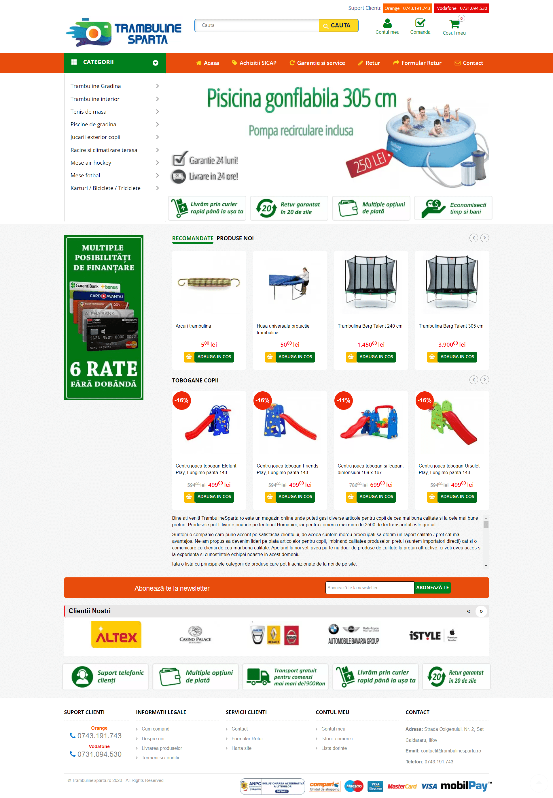 Online store that sells garden trampolines, indoor trampolines, tennis tables, garden pools, outdoor toys and much more.online care comercializeaza trambuline pentru gradina, trambuline pentru interior, mese pentru tenis, piscine de gradina, jucarii de extesior si multe altele.