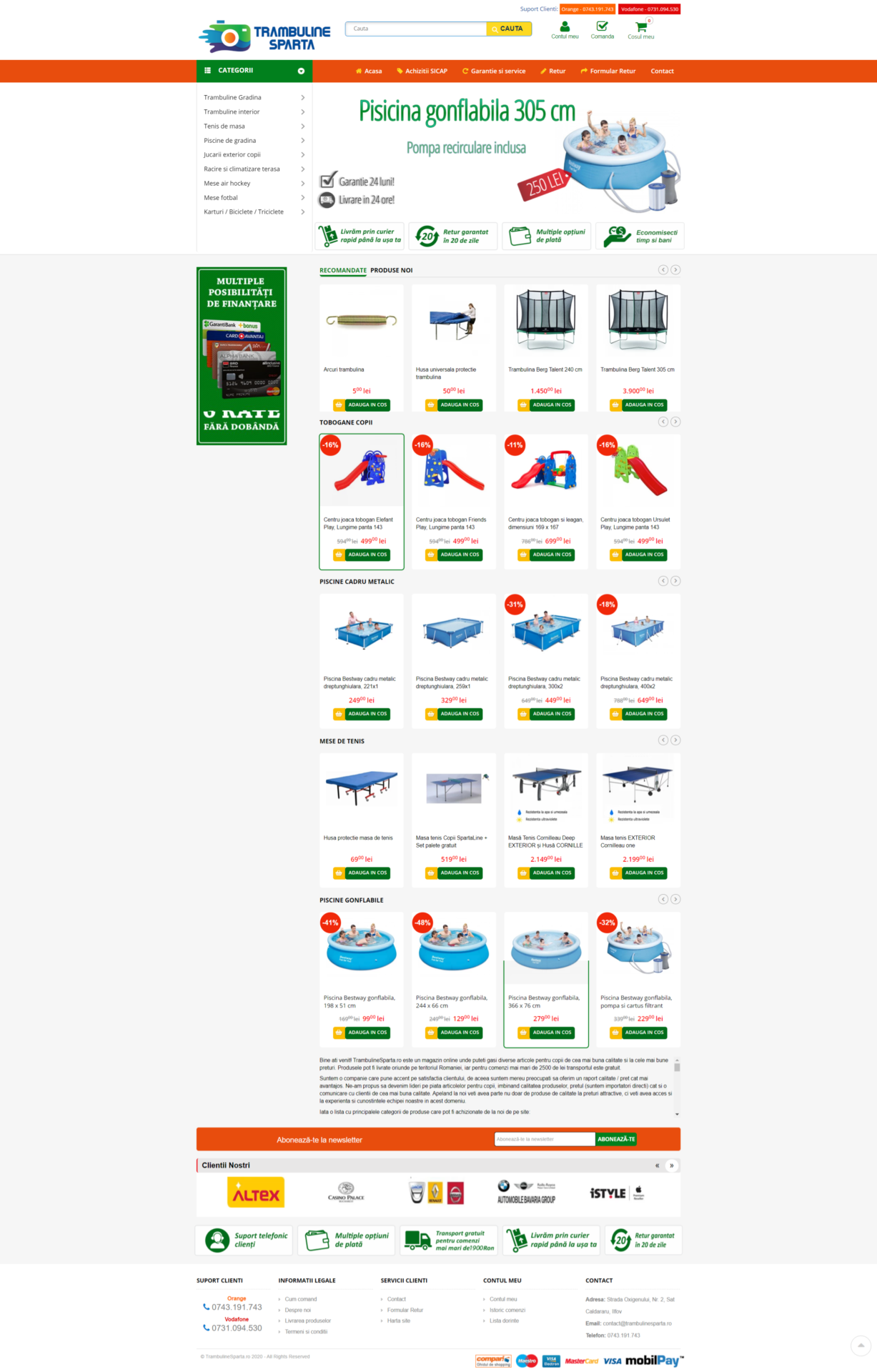 Magazin online care comercializeaza trambuline pentru gradina, trambuline pentru interior, mese pentru tenis, piscine de gradina, jucarii de extesior si multe altele.
