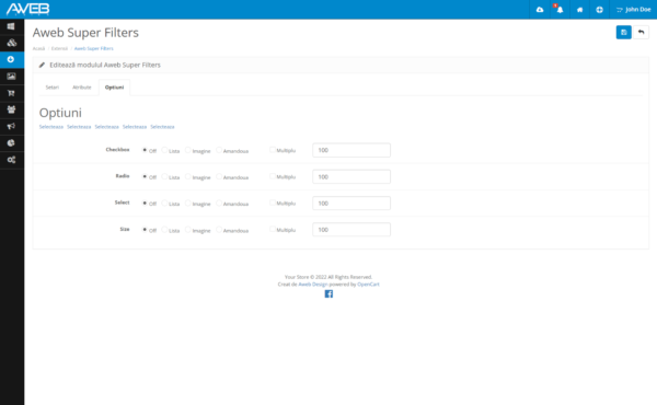 Administrarea filtrelor se face dintr-o singura pagina astfel incat sa nu mai trebuiasca sa editati fiecare produs in parte si sa adaugati filtrele necesare.
